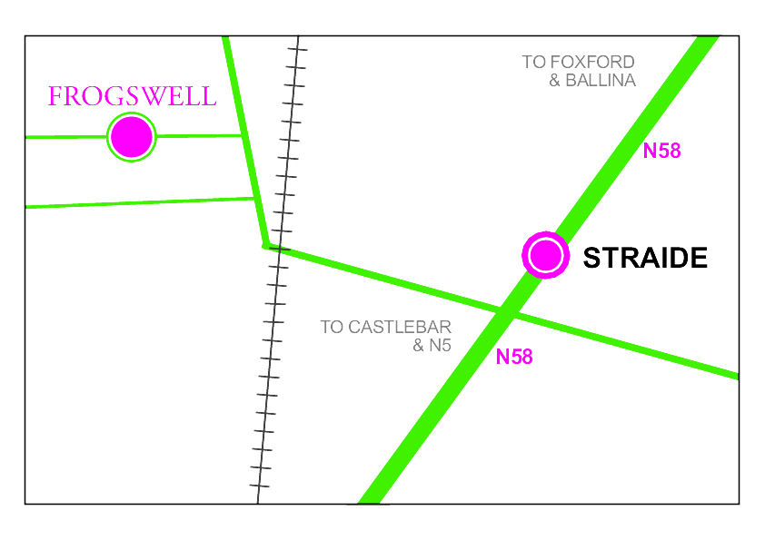 OSI Grid Ref: M2497 OSI Map sheet 31 Nearest station: Foxford Nearest Bus: Straide Village